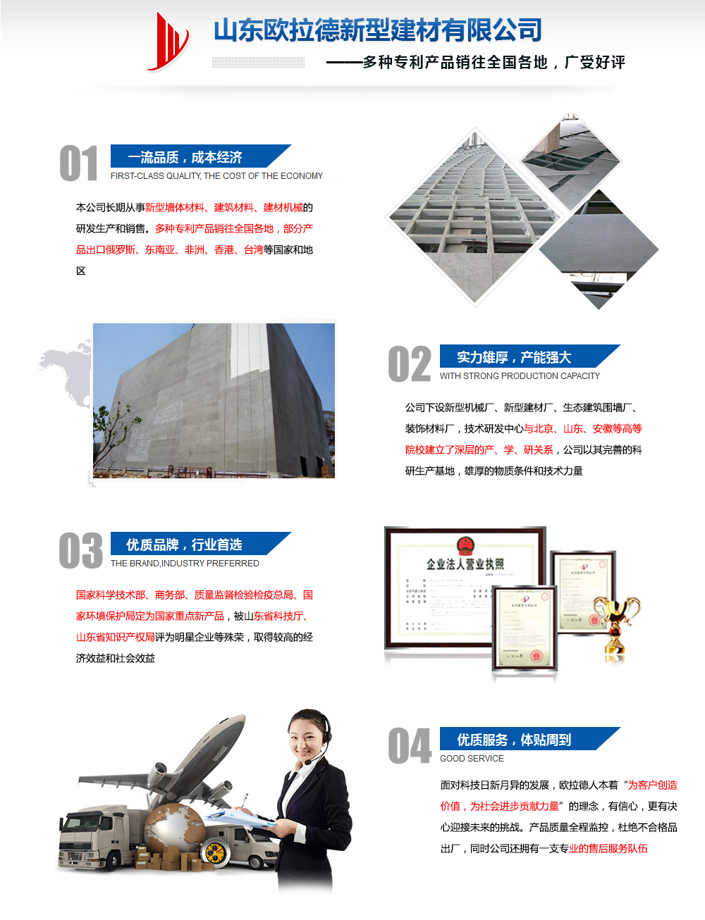 山東歐拉德新型建材有限公司長期從事新型建筑材料水泥纖維板,鋼結構閣樓板,loft樓層板,復式夾層樓板,挑高夾層樓層板的研發生產和銷售,是國家重點高新技術企業,占地68000平方米,擁有50000多平方米的現代化廠房和辦公樓,一期投資2.8億,生產基地位于山東省德州市平原縣開發區。多種產品銷往各地,部分產品出口俄羅斯、東南亞、非洲、香港、臺灣等國家和地區。本公司所有產品全部廠家發貨,歡迎咨詢選購!